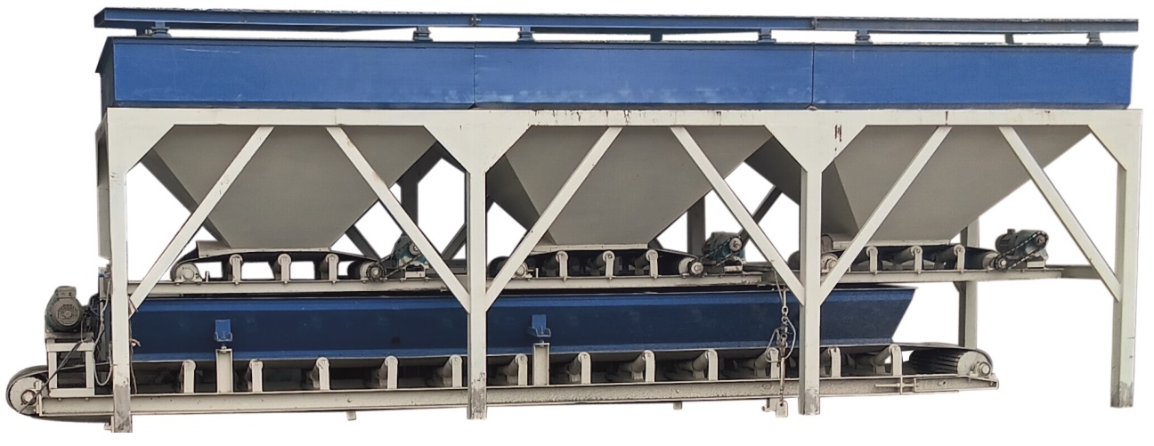 - 3 Bin Inline Auto Weigh Batcher Plant – Approx 3.5 Cu.Mt Capacity of Each Bin:: Top Covered Vibrating Screen (Jali) 0.5HP, Capacity Each Bin 3.5 Cu.Mt (Size 7.5 L x 6 W x 4.5 H), Bin Batching Plant Made Of 4mm Thk. Ms Plate with Heavy Pipe & Channel Supports, All Bin Auto Feed Conveyor With 1HP 3Nos Motor, 650mm Wide Conveyor Belt For Receiving Material And Weighment, 5HP Motor and Gearbox, Conveyor Belt Supported On Load Cells. Hopper to Retain Material on Conveyor Belt. Vibrator Motor 0.25HP (3 Nos.) For Fly Ash Hopper Bin, Sand Hopper and Concrete Hopper Bin.